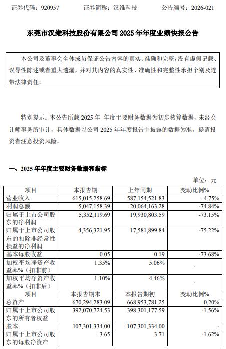 2月27日,汉维科技(920957)发布2025年业绩快报。快报显示,公司2025年实现营业收入6.15亿元,同比增长4.75%;归母净利润535.21万元,同比下降73.15%;扣非净利润435.63万元,同比下降75.22%。