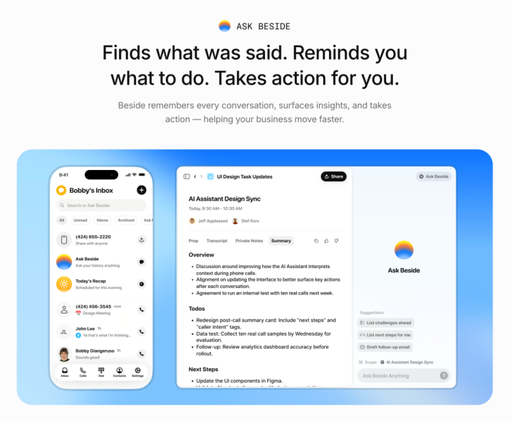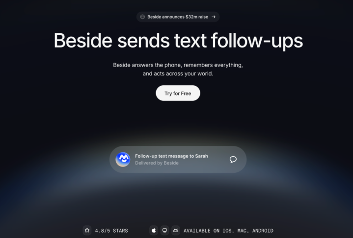 Beside完成3200万美元融资,从底层重建电话系统,以AI赋能电话/短信的理解、记录与行动转化,精准服务1亿靠电话工作的一线从业者与小企业,破解未接来电、客户细节遗漏等痛点,成为真实经济的智能沟通基础设施