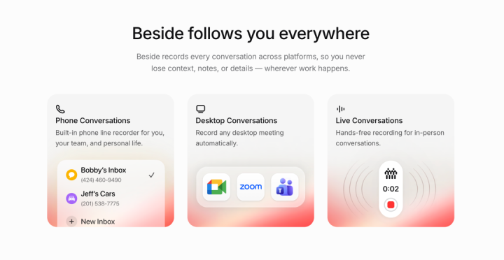 第二是产品方法的不同。许多语音AI试图模拟人类,成为一个虚拟的客服人员。而Beside的理念是淡化AI的存在感,让它融入背景并完成工作。它不试图假装是人类,也不仅仅停留在转录层面(像许多笔记应用那样)。它提供的是一种优质体验,让客户感到被看见、被理解、被照顾,而不需要明确要求。这种哲学上的不同导致了完全不同的产品设计和用户体验。