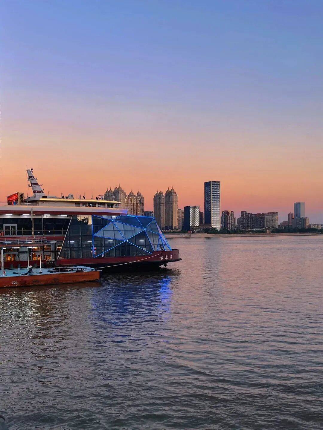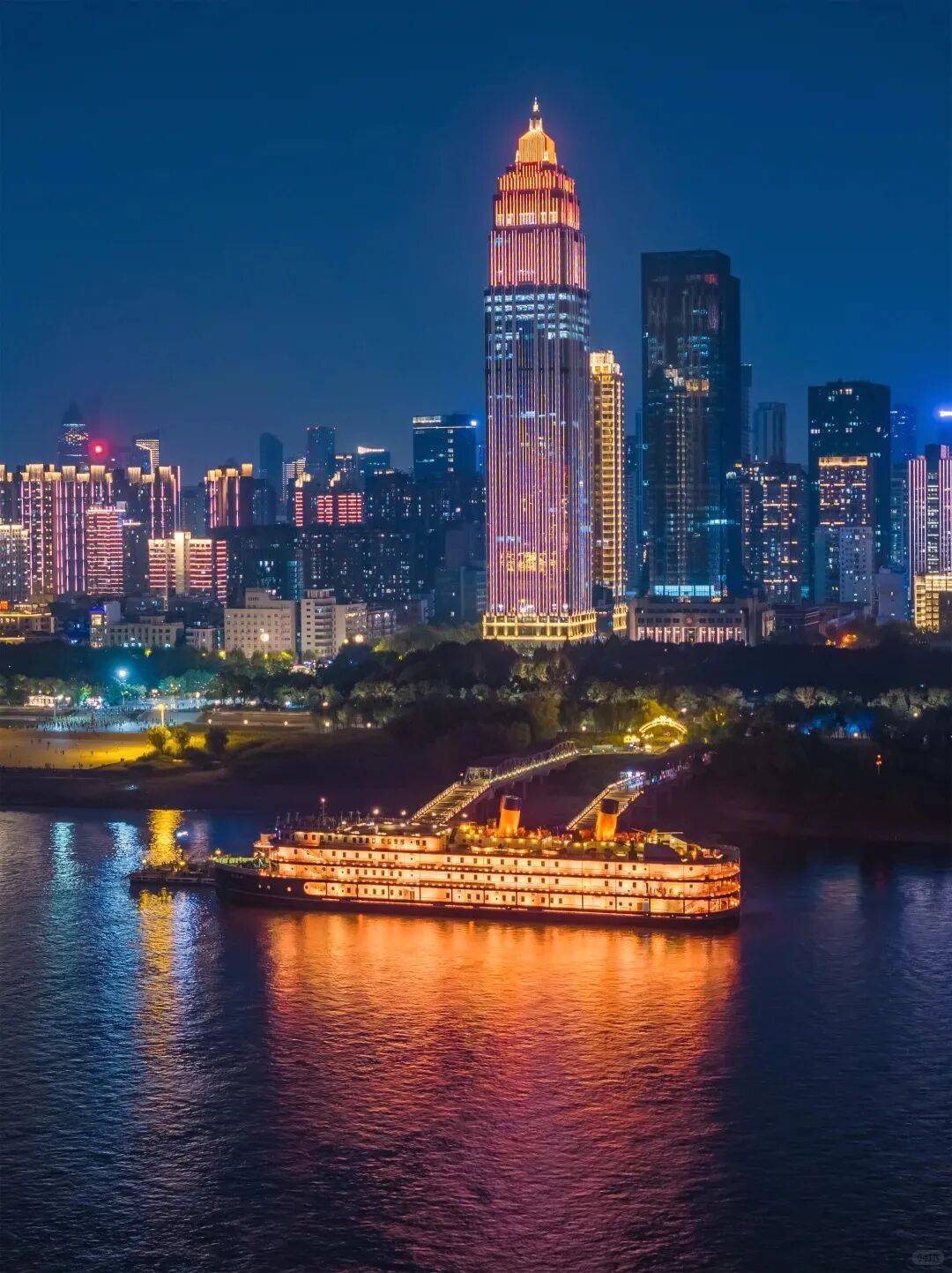 夜幕里,江心上的“知音号”静待启航,暖黄灯火在水面晕开粼粼波光,与沿岸楼宇群交相辉映。