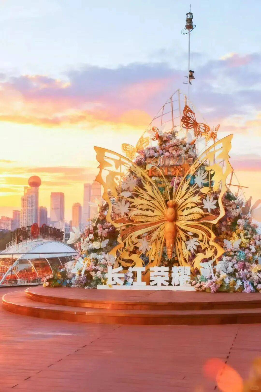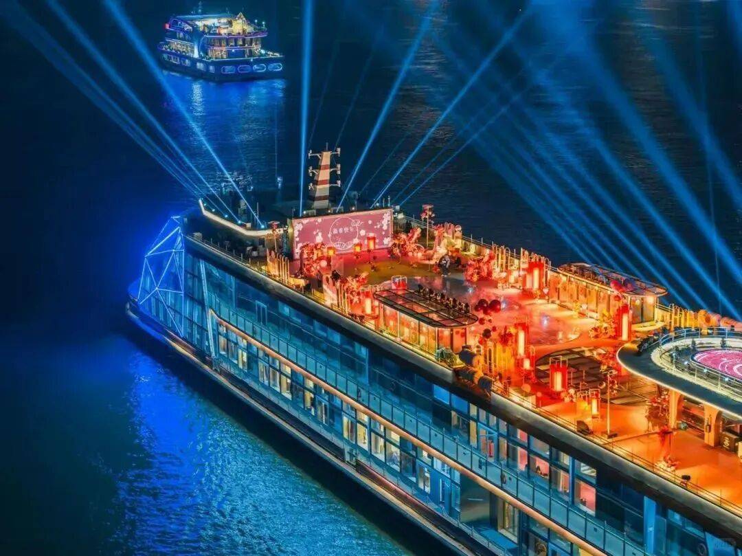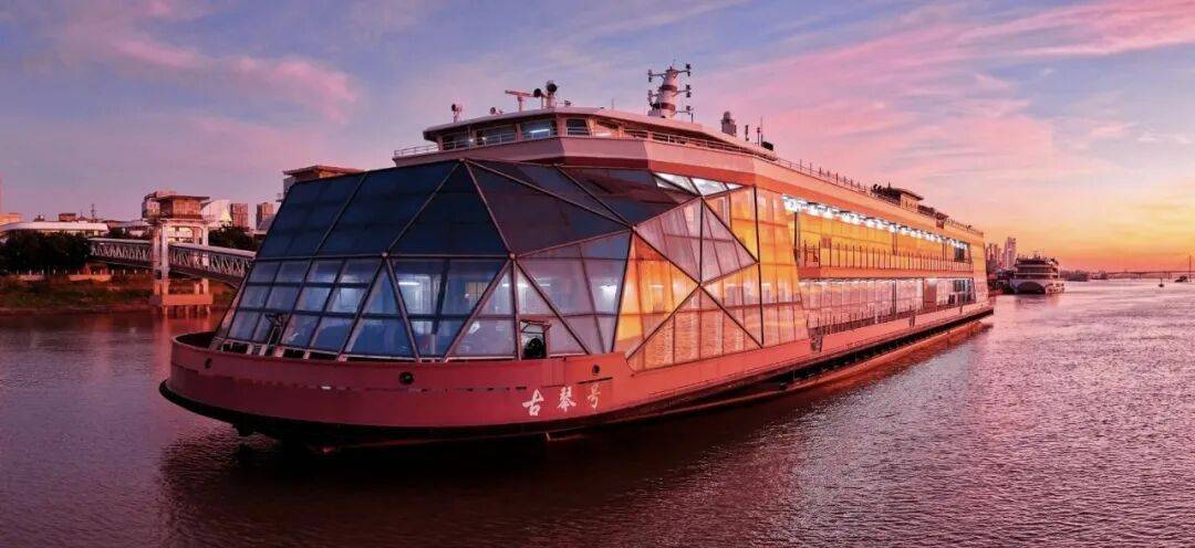 落日时分,夕阳将江面晕染成橘色,国潮电音与樱花随风共舞,甲板之上,歌手轻吟浅唱,晚风与旋律交织,将浪漫揉进暮色里。
