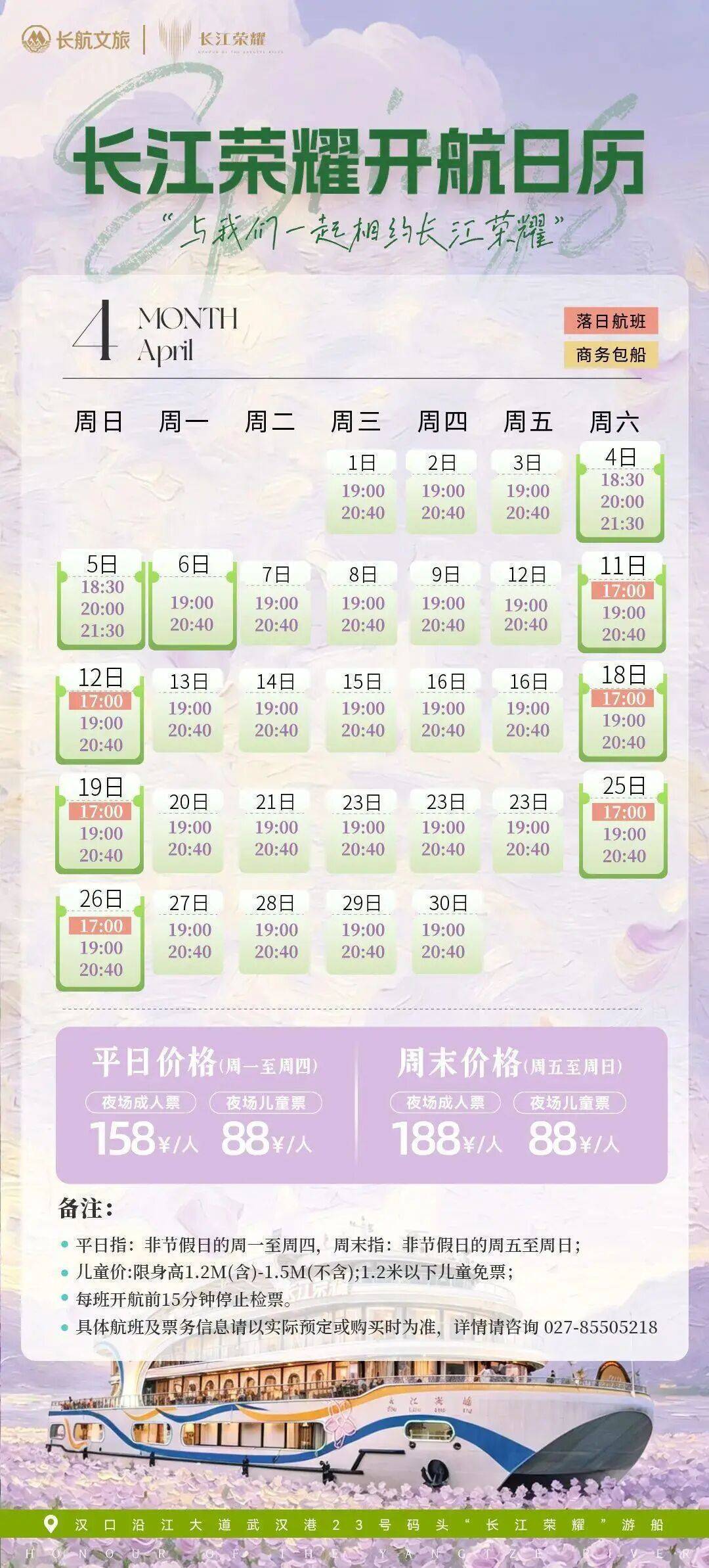 登船地址丨江岸区沿江大道武汉港20号码头