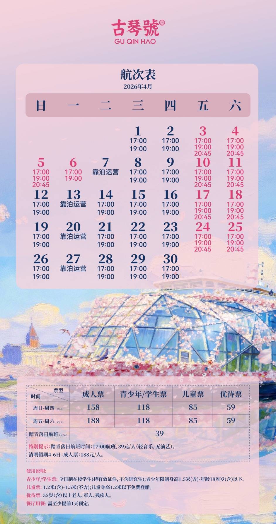 “古琴号”4月航班上新,性价比高的落日航班,专为偏爱白日江景的你而来,天光正好,登上甲板,任晚风轻拂,看落日缓缓沉入江面。
