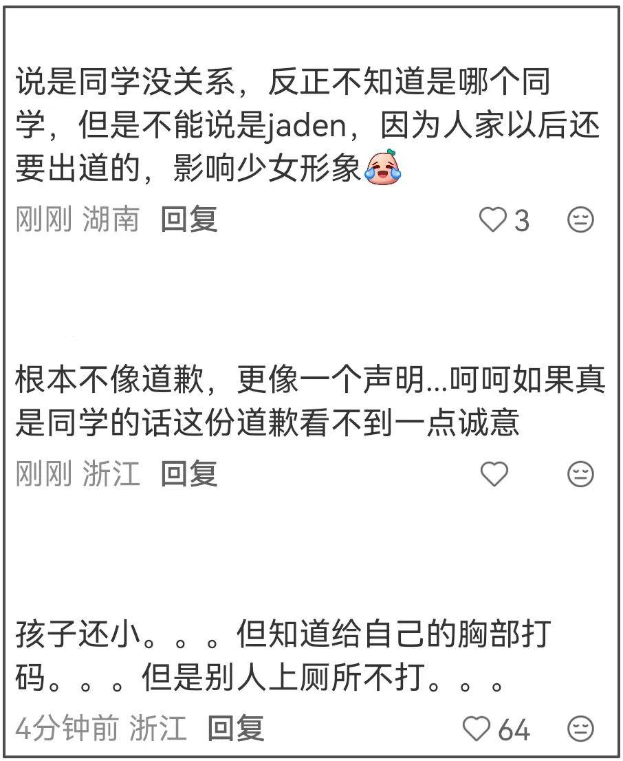 钟丽缇的长文并没能将考拉从争议中解救出来,还让自己也陷入舆论风波。在大家看来,照片中的女孩不是Jaden而是同学只能说明考拉的行为更加过分,堪称霸凌。钟丽缇着重澄清的举动不像是为了素人着想,更像是为Jaden的形象着想,担心Jaden少女形象受损,影响之后出道。