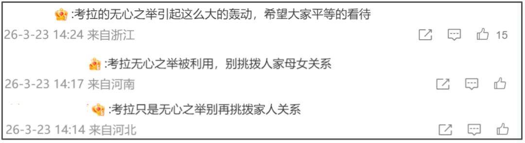 更令人觉得愤愤不平的是,钟丽缇这篇长文的评论区堪称“岁月静好”,前排热门的真实网友评论全部“消失”,充斥着“钟丽缇为人母的辛苦”、“原谅考拉无心之过”等评论。