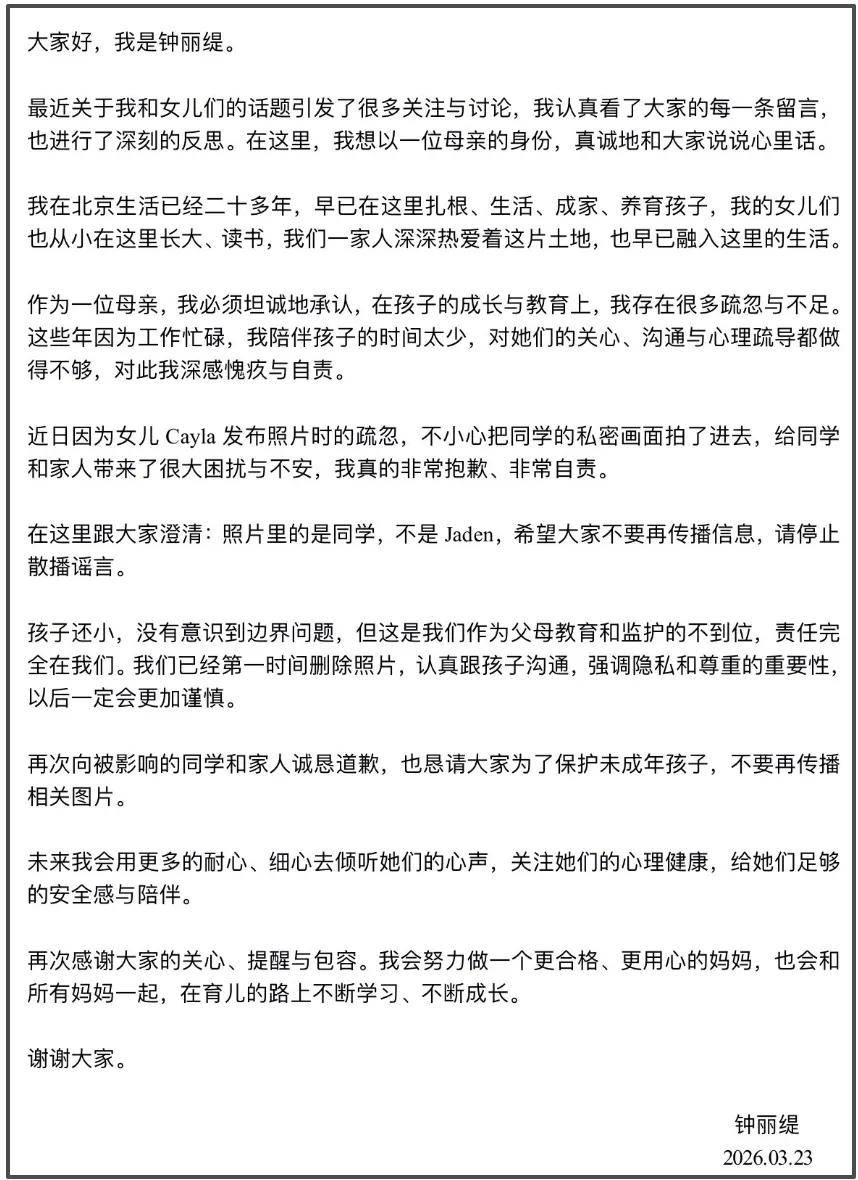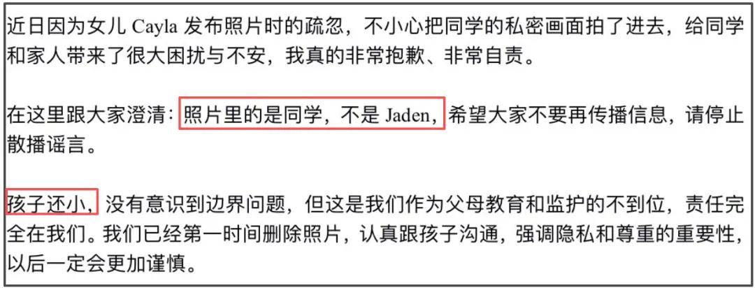 文章中,钟丽缇对背景中暴露隐私的同学只有一句轻描淡写的道歉。之后,她着重地澄清了一件事,那就是照片中暴露隐私的是同学,不是自己的二女儿Jaden。此前,有许多人猜测马桶上的女孩是考拉的姐姐,现在钟丽缇给出了正确答案,是同学。澄清之后就是推脱,一句“孩子还小”推脱了考拉身上的责任,之后又强调是父母教育和监护不到位。
